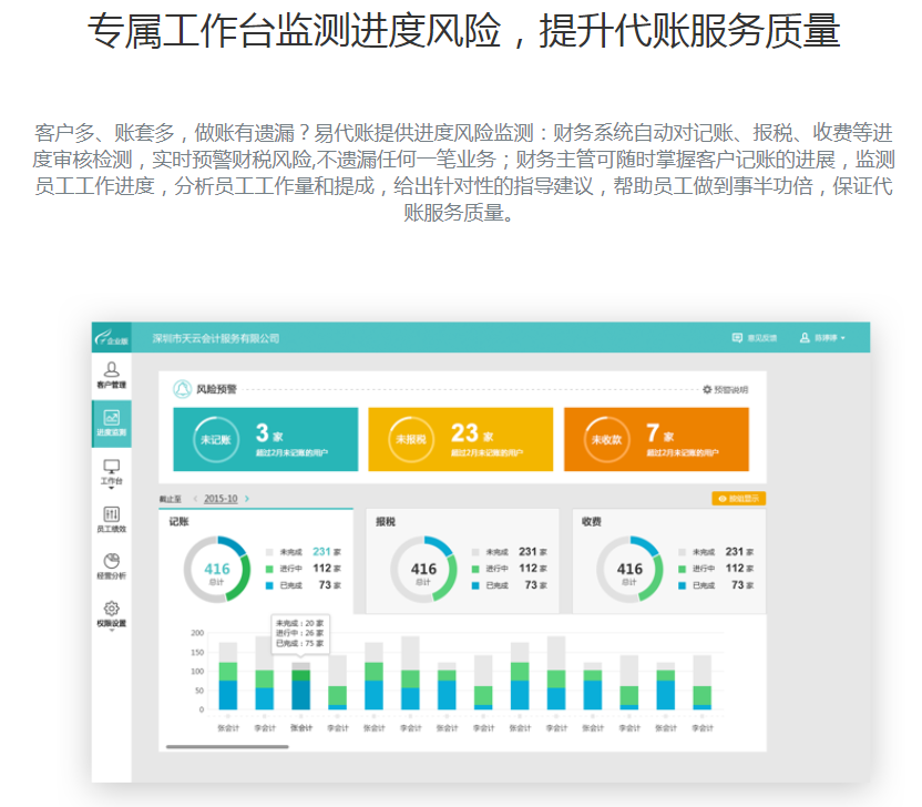 客戶(hù)多、賬套多,做賬有遺漏?易代賬提供進(jìn)度風(fēng)險(xiǎn)監(jiān)測(cè):財(cái)務(wù)系統(tǒng)自動(dòng)對(duì)記賬、報(bào)稅、收費(fèi)等進(jìn)度審核檢測(cè),實(shí)時(shí)預(yù)警財(cái)稅風(fēng)險(xiǎn),不遺漏任何一筆業(yè)務(wù);財(cái)務(wù)主管可隨時(shí)掌握客戶(hù)記賬的進(jìn)展,監(jiān)測(cè)員工工作進(jìn)度,分析員工工作量和提成,給出針對(duì)性的指導(dǎo)建議,幫助員工做到事半功倍,保證代賬服務(wù)質(zhì)量。