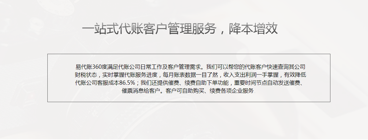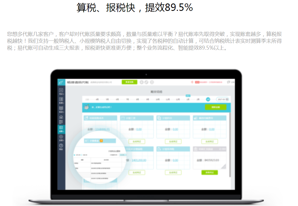 您想多代賬幾家客戶(hù),客戶(hù)卻對(duì)代賬質(zhì)量要求頗高,數(shù)量與質(zhì)量難以平衡?易代賬率先取得突破,實(shí)現(xiàn)賬套越多,算稅報(bào)稅越快!我們支持一般納稅人、小規(guī)模納稅人自由切換,實(shí)現(xiàn)了各稅種的自動(dòng)計(jì)算,可結(jié)合納稅統(tǒng)計(jì)表實(shí)時(shí)測(cè)算季末所得稅;易代賬可自動(dòng)生成三大報(bào)表,報(bào)稅更快更準(zhǔn)更方便;整個(gè)業(yè)務(wù)流程化、智能提效89.5%以上。