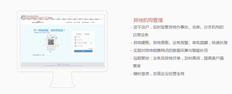 除滿足企業(yè)對本地業(yè)務(wù)管理需求外,還幫助企業(yè)對異地倉庫、辦事處、門店、分支機構(gòu)進行管控。